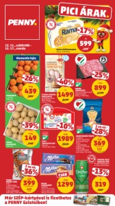 PICI árak 40% kedvezmény. AKÁR * a 28. oldalon szereplő termékek esetében. * Ajánlatunk 2025. december 11. és december 17. között, illetve a készlet erejéig érvényes. Az árváltozás jogát fenntartjuk. A nyomdai hibákért felelősséget nem vállalunk. Az árak forintban, áfával együtt értendők. A * jelölt árucikkek nem állandó termékei kínálatunknak, ezért előfordulhat, hogy az akció kezdete után rövid időn belül elfogynak. Ha gondos tervezésünk ellenére a termék az akció vége előtt elfogyna, felvilágosításért fordulj az üzletvezetőhöz. Kiszolgálás csak a háztartásokban szokásos mennyiségben. A termékek elérhetősége üzletenként eltérő. Az átállás miatt előfordulhat, hogy egy üzletben egy termék csak betétdíjas vagy csak nem betétdíjas vagy éppen mindkettő változata elérhető. Non-food termékeket a Budapest, József körúti, Thaly Kálmán utcai, Király utcai, Liget téri, Bük, Siófok, Fő téri és Polgárdi üzletünkben nem árusítunk. A legközelebbi áruházaink listáját megtalálod a penny.hu weboldalunkon, a boltkereső menüpont alatt. Köszönjük a megértést! Készült a PENNY Market Kft. megbízásából. Felelős kiadó: a Kft. ügyvezető igazgatója. Reklámújságunk terjesztésével kapcsolatos panaszodat az ugyfelszolgalat@penny.hu e-mail címre küldheted el. A tájékoztatás nem teljes körű, részletek az üzletekben. A beszállító láncot érintő háborús helyzet előre nem látható működési problémákat okozhat szállítóinknál, ami hatással lehet termékeink elérhetőségére. Aktuális ajánlataink nyomdába adásáig ilyen problémát az adott szállító még nem jelzett. Már SZÉP-kártyával is fizethetsz a PENNY üzleteiben! DÁRDÁS HÁTSÓ CSÜLÖK füstölt hűtött termék kg CLASSIC PANGASIUS FILÉ gyorsfagyasztott töltő tömeg: 800 g, 1749 Ft/kg VÁLOGATVA ITTHONRÓL BINO CITROM ÍZESÍTŐ 40% citromlé tartalommal 1,5 liter, 186 Ft/liter VÁLOGATVA ITTHONRÓL KARÁT CSIRKEMELL SONKA szeletelt 100 g, 3390 Ft/kg DIÓS VAGY MÁKOS RÚD kelt tésztából 295 g, 2031 Ft/kg EPER I. osztály csomagolt 250 g, 3596 Ft/kg ZELLER GUMÓ I. osztály lédig, kg VÁLOGATVA ITTHONRÓL VÁLOGATVA ITTHONRÓL PENNY TÖLTÖTT OSTYA kakaós, citrom ízű, vanília ízű krémmel 250 g, 1196 Ft/kg gyorsfagyasztott 2489 1399 Ft/kg -43% 1999 1399 Ft -30% 425 339 Ft -20% 349 279 Ft -20% 40% töltelék 699 599 Ft/db -14% 1199 899 Ft/cs. -25% 399 239 Ft/kg -40% 435 299 Ft -31% Sze Ke Hé 82 PICI árak. Egyszerűen okosabb. Az eladási ár a visszaváltási díjat nem tartalmazza. 12. 15., hétfő - 12. 17., szerda