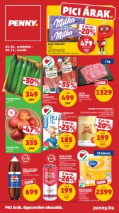 PICI árak 40% kedvezmény. AKÁR * * a 24. oldalon szereplő termékek esetében. Ajánlatunk 2026. március 5. és március 11. között, illetve a készlet erejéig érvényes. Az árváltozás jogát fenntartjuk. A nyomdai hibákért felelősséget nem vállalunk. Az árak forintban, áfával együtt értendők. A * jelölt árucikkek nem állandó termékei kínálatunknak, ezért előfordulhat, hogy az akció kezdete után rövid időn belül elfogynak. Ha gondos tervezésünk ellenére a termék az akció vége előtt elfogyna, felvilágosításért fordulj az üzletvezetőhöz. Kiszolgálás csak a háztartásokban szokásos mennyiségben. A termékek elérhetősége üzletenként eltérő. Az átállás miatt előfordulhat, hogy egy üzletben egy termék csak betétdíjas vagy csak nem betétdíjas vagy éppen mindkettő változata elérhető. Non-food termékeket a Budapest, József körúti, Thaly Kálmán utcai, Király utcai, Liget téri, Aba, Bük, Siófok, Fő téri Polgárdi és Tab üzletünkben nem árusítunk. A legközelebbi áruházaink listáját megtalálod a penny.hu weboldalunkon, a boltkereső menüpont alatt. Köszönjük a megértést! Készült a PENNY Market Kft. megbízásából. Felelős kiadó: a Kft. ügyvezető igazgatója. Reklámújságunk terjesztésével kapcsolatos panaszodat az ugyfelszolgalat@penny.hu e-mail címre küldheted el. A tájékoztatás nem teljes körű, részletek az üzletekben. A beszállító láncot érintő háborús helyzet előre nem látható működési problémákat okozhat szállítóinknál, ami hatással lehet termékeink elérhetőségére. Aktuális ajánlataink nyomdába adásáig ilyen problémát az adott szállító még nem jelzett. Kérjük, újrafeldolgozáshoz gyűjtsd a használt papírt. KARÁT SERTÉSSONKA szeletelt 100 g, 3990 Ft/kg MILKERIA KÁVÉTEJSZÍN 20 x 10 g 1145 Ft/kg, 11 Ft/db SAN FABIO PASSZÍROZOTT PARADICSOM 500 g, 518 Ft/kg BRAVOS KÁVÉ classic őrölt 250 g, 5116 Ft/kg FAGYLAKOMA DÍNÓ NUGGETS csirkemellfiléből gyorsfagyasztott 500 g, 2398 Ft/kg VÁLOGATVA ITTHONRÓL VÁLOGATVA ITTHONRÓL SISSY NATÚR VAJKRÉM 250 g, 1996 Ft/kg 90% DIÓS CSIGA MANDARIN I. osztály lédig, kg CÉKLA I. osztály lédig, kg 250 g őrölt 20 db 579 399 Ft -31% 315 229 Ft/cs. -27% 329 259 Ft -21% 1599 1279 Ft -20% gyorsfagyasztott 1749 1199 Ft -31% 629 499 Ft -20% 169 129 Ft/db -23% 999 599 Ft/kg -40% 299 169 Ft/kg -43% Sze Ke Hé 42 PICI árak. Egyszerűen okosabb. 03. 09., hétfő - 03. 11., szerda